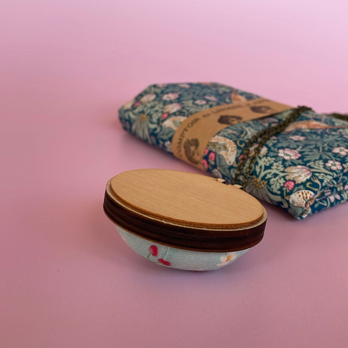- The pincushion is framed in a Dandelyne wooden miniature embroidery hoop pendant, attached to a bronze necklace chain.